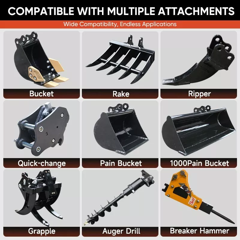 Widely used:Can be used in conjunction with quick change tools to replace various auxiliary tools such as scarifiers, rakes, rotary drills, wood grabbers, tilt buckets, hydraulic thumb clamps, mud buckets, etc, Due to its compact and user-friendly design, this trenching machine is very suitable for drilling, excavation, grabbing, pushing soil, cleaning ditches, small-scale excavation, rock fragmentation, landscape beautification or construction.