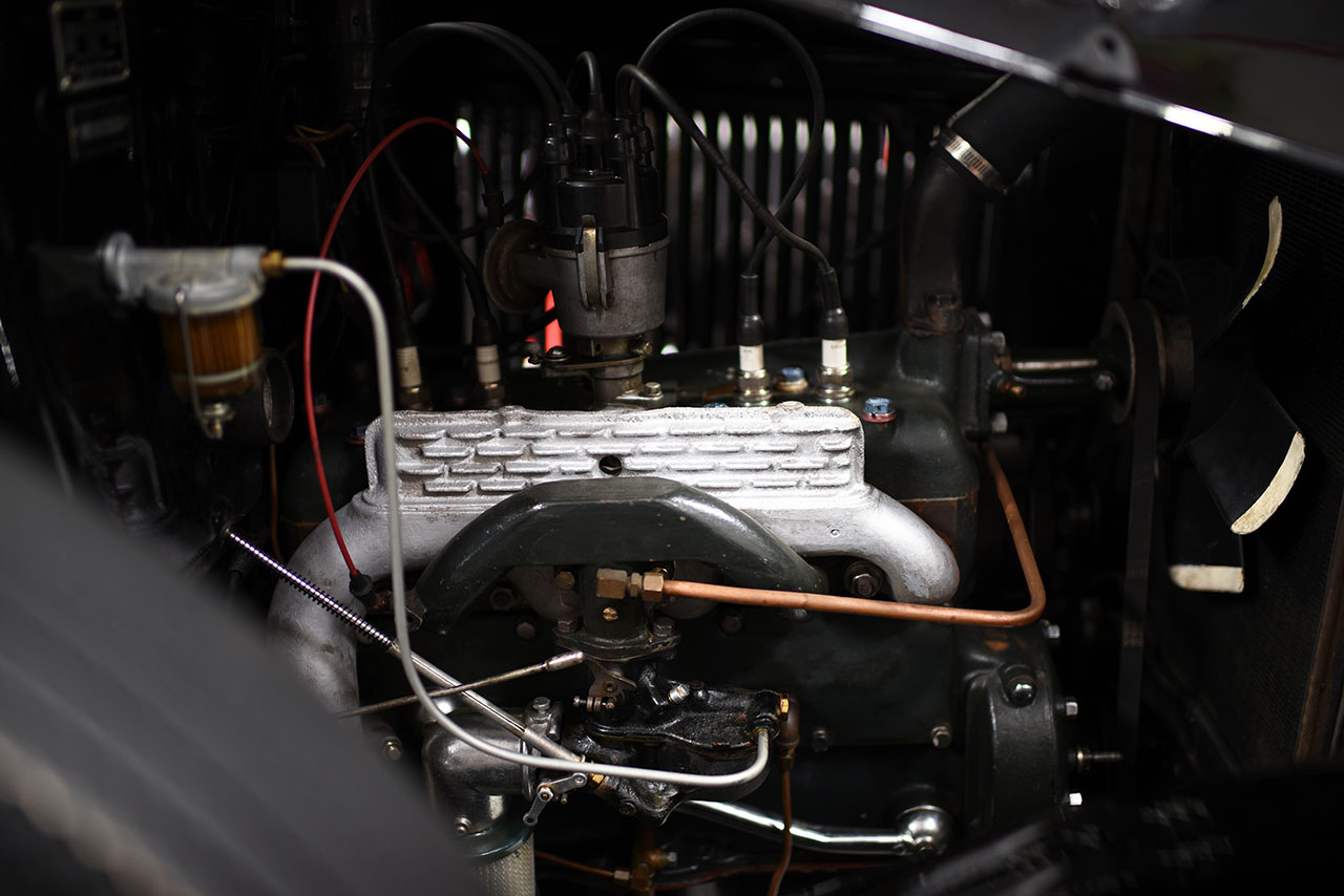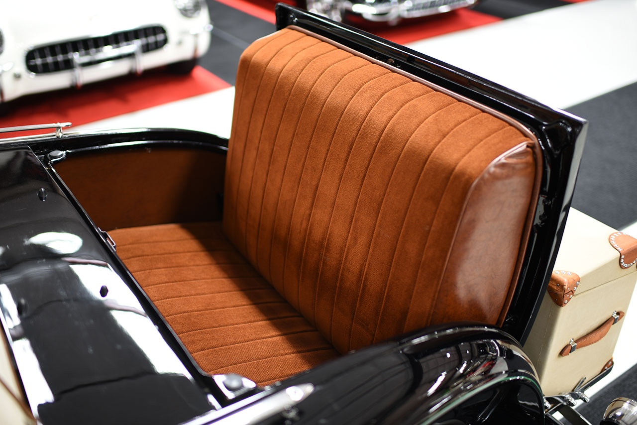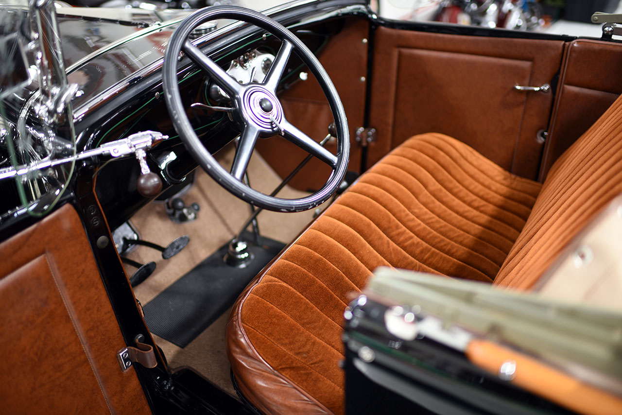 This Highboy Roadster features a fiberglass body resting on a Heidts extended chassis, also painted in Viper Red. The steel hood has been carefully stretched and worked to fit the extended chassis. The front-end suspension allows for smooth handling, while the perfect stance is achieved with 17 and 20-inch staggered American Racing wheels, complemented by 205/40 Wanli tires in the front and 285/50 Wanli tires in the rear.