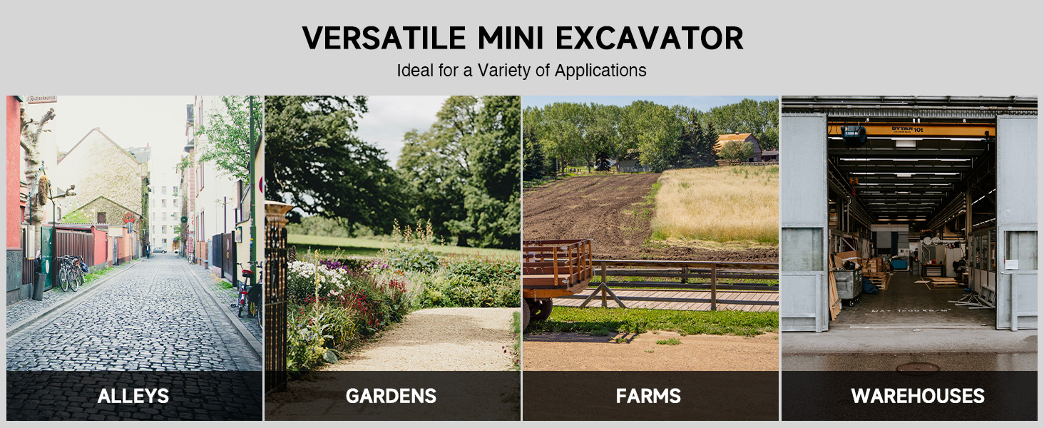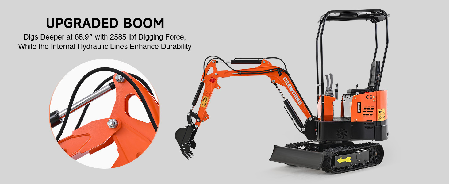 Designed for Narrow Spaces: With a compact design and a 5.7 ft. maximum digging depth, this 1-ton mini excavator by Creworks is tailor-made for construction in narrow lanes, alleys, backyards, gardens, and other tight spaces.