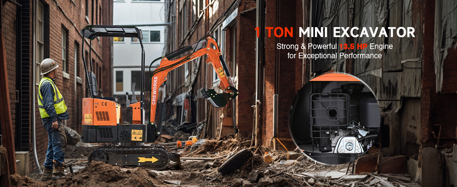 1 Ton Mini Excavator: With a compact design and a 6.1 ft. maximum digging depth, this light yet powerful mini excavator by Creworks is tailor-made for construction in narrow lanes, alleys, backyards, gardens, and other tight spaces.