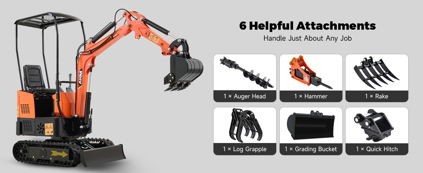 Multiple Attachments Included: This compact excavator comes with attachments for a wide range of jobs. The grapple and bucket grab and lift tree branches, the auger drill digs holes for fence poles, the hammer handles concrete and asphalt rocks, the rake removes and piles brush, roots, and stumps, and the quick hitch changes attachments.