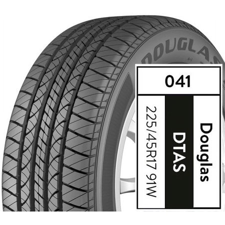 The Douglas Touring A/S 225/45R17 91W All-Season Tire offers an all-season silica tread compound that balances wet traction, dry traction and treadwear. The diagonal siped tread blocks are designed to help offer all-season traction in wet and dry conditions. The broad circumferential grooves help evacuate water and slush from the tread for enhanced grip. The sturdy shoulder blocks help provide confident handling.
