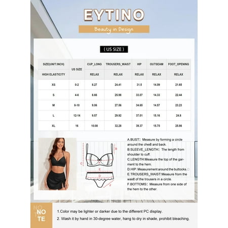 Brand: Eytino Eytino Womens Bikinis Gender: Women Woman; Ladies Lady; Female Item Type:Bikinis for women, bikini swimsuits for women, women’s bikini, bikini sets for women Feature: Push Up, High Waisted, Halter, V-neck, Adjustable side pull drawstring Style: Loose Fit, Stylish Pattern: Solid Color Swimsuit Style: Bikinis Occasion: Vacation,holiday, casual, beach, pool, water party Season: Summer,spring,fall, autumn Type: Women’s Push Up Halter Bikini High Waisted Drawstring Two Piece Swimsuits Womens Bathing Suits Skirt 2 Piece Swimwear Women’s Two-Piece Swimsuit High-Waisted Bikini Set with Swim Skirt V-Neck Bathing Suit High Waisted Women 2 Piece Tummy Control Swimsuit Swim Skirt Bikini Sets Women’s V Neck Bikini High Waist Skirt 2 Piece Swimsuit Women’s 2 Piece Sets Bikini Swimsuit Women’s Swimsuit Halter Bikini with Skirt Set Women Bikini Sets Split Swimsuit 2-Piece Swimming Suit swimsuit women bathing suits for women womens swimwear swimming suits for women womens bathing suits swimsuits for women Q&A Q1:Are you authentic? A1:We are the only shop of the brand,guarantee 100% genuine. Q2: True to size? A2:They are standard US sizes. We have size chart and shopping guide. You can choose the size according to your figure. It will be the best one for you. Q3: What material is it made from? A3: Made by 82% Polyamide, 18% Elastane. Q4: Does it has a smell? A4: No smell at all, don’t worry. Q5: Is it the same color as in the picture? A5: We try our best to make color is the same with our dress, but please know that color may be lighter or darker due to the different PC display. NOTE: Look for “Eytino” brand clothing and purchase it, “Sold & shipped by Eytino” which is genuine. Other pirated versions have quality problems that cannot be guaranteed.