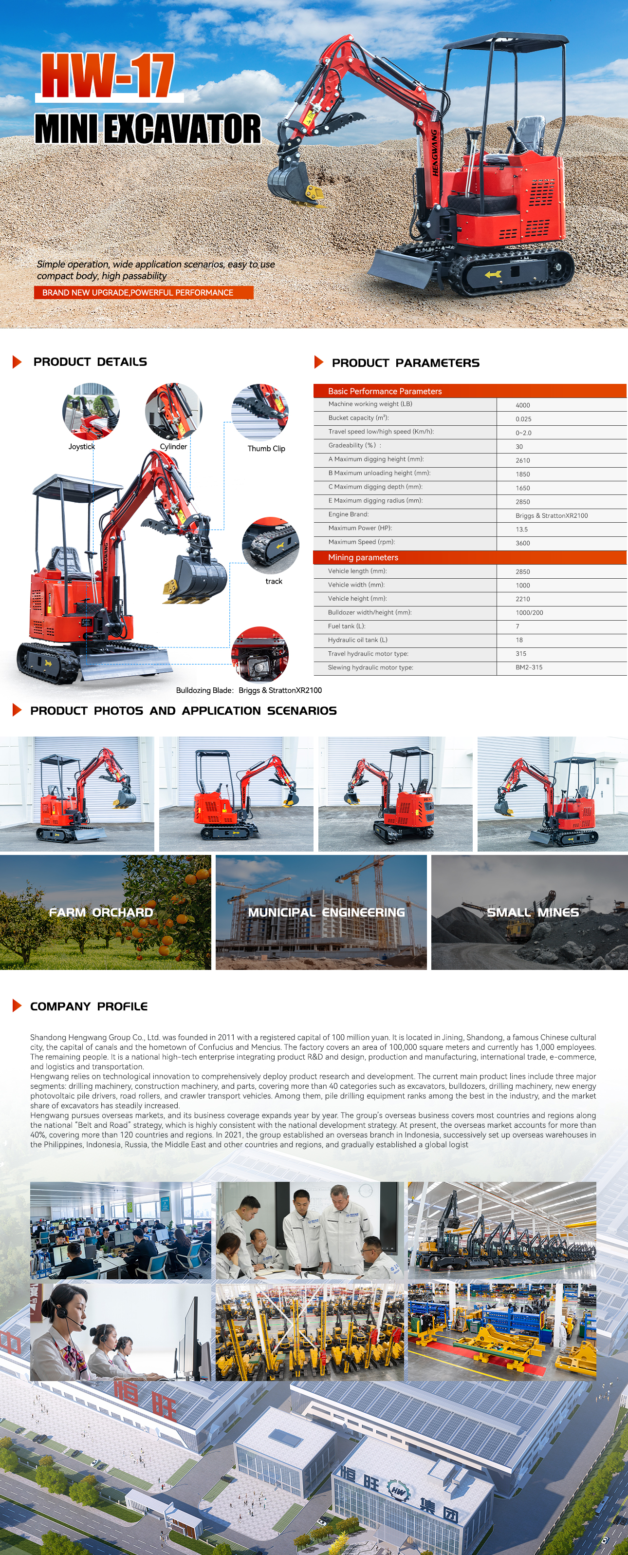 Excellent Maneuverability: The meticulously designed HW-17 mini excavator easily navigates confined spaces, allowing you to effortlessly navigate complex construction site environments. Suitable applications: small construction sites, urban renewal projects, narrow space excavation, landscaping, and agricultural work.