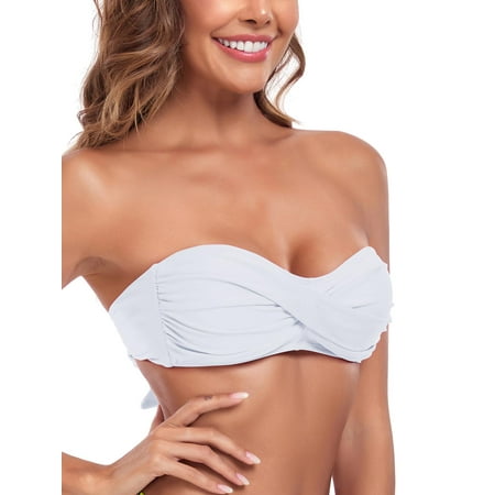 No underwire,Soft molded cup,Removable halter strap Solid bikini top is great for mix and match with most of bikini bottom Ruched detail in the front,Tie at the back,you can adjustable the degree of tightness Bandeau bikini top featuring twisted front and tie back,Sexy bikini bandeau,nice gift for women These is thick and holds up well in the wash,the adjustable back means that you can tighten this as much as you need too and the adjustable neck strap allows you to avoid tan line when you are at the beach